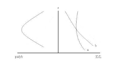 In that case, as the intensity of capital increases (K/L goes up) at first, as before, a is the capital intensive good, but now there is a switch and b becomes the capital intensive good at lower rates of interest. The consequence is that for a part of the process as the capital-labor ratio increases the price of a with respect to b increases, but after the switch, the other part of the process, it decreases. The relative abundance of capital and labor is not a guide for relative prices anymore, and as a result, neither can it determine patterns of specialization.