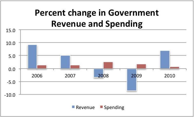The graph below shows percent changes in total government spending and revenues since 2006.